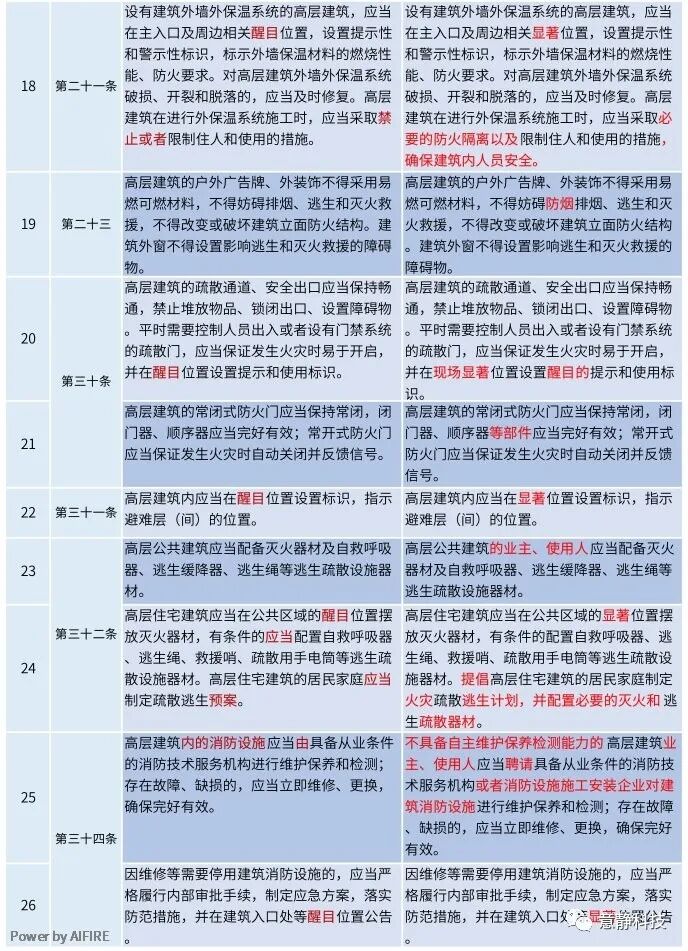 (二)规范高层建筑日常消防安全管理。总结分析近年来高层建筑火灾事故教训,结合现行法律法规和消防技术规范的要求,对容易引发火灾事故和造成群死群伤的重点部位、特殊场所以及用火用电的日常消防安全管理关键环节进行了细化和明确。一是加强外保温材料的管理。《规定》明确对使用易燃、可燃材料作为高层建筑外墙保温材料以及在高层建筑外墙违规动火用电、燃放烟花爆竹做了禁止性规定,并要求及时修复破损、开裂和脱落的外墙保温系统,并在醒目位置设置提示性和警示性标识,标示外墙保温材料的燃烧性能、防火要求。二是细化了重点部位的管理要求。《规定》对高层建筑内的厨房、仓库、设备用房、管道井、避难层、消防车通道、登高操作面、疏散通道、安全出口等方面分别提出了具体的消防安全管理措施。三是规范用火、用电、用气行为管理。在用火管理方面,《规定》对开展明火作业的审批程序、现场监护等方面做了明确规定,并要求高层公共建筑应当根据自身使用性质,划定禁火禁烟区域。在用电管理方面,《规定》明确高层建筑电器设备的安装使用及其线路敷设、维护保养和检测应当符合消防技术标准及管理规定。在用气管理方面,《规定》明确高层建筑内燃气用具的安装使用及其管路敷设、维护保养和检测应当符合消防技术标准及管理规定。四是全面推行标识化管理。《规定》明确高层建筑的业主、使用人应当在消防车通道、消防车登高操作场地、灭火救援窗、消防水泵接合器、常闭式防火门等部位设置提示性、警示性标识。消防设施设备应标识开、关状态,并采取铅封等限位措施。五是细化了消防设施设备的日常维护管理。《规定》对高层建筑防火检查、巡查的频次和具体内容进行了明确,并规定高层建筑内的消防设施应当由具备从业条件的消防技术服务机构进行维护保养和检测。同时,《规定》对消防控制室值班人员的配置、资格、技能要求等进行了细化。